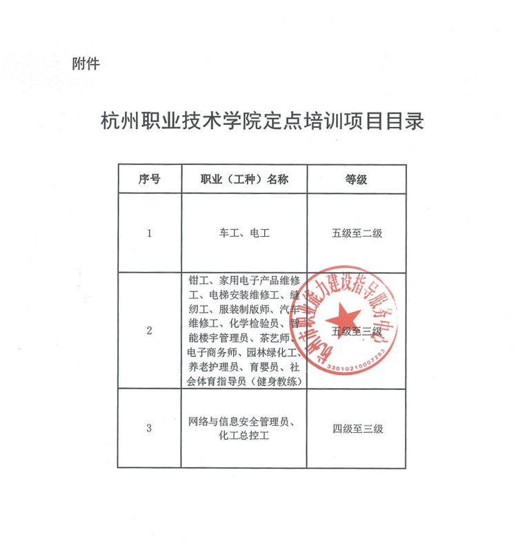 根据杭州市职业能力建设指导服务中心下发的《关于开展2022年杭州市职业技能定点培训机构认定工作的通知》及《杭州市职业技能定点培训机构管理办法(试行)》(杭劳社培〔2011〕56号)文件要求,经集中申报,现将我校2022年杭州市职业技能定点培训项目申报结果通知如下: